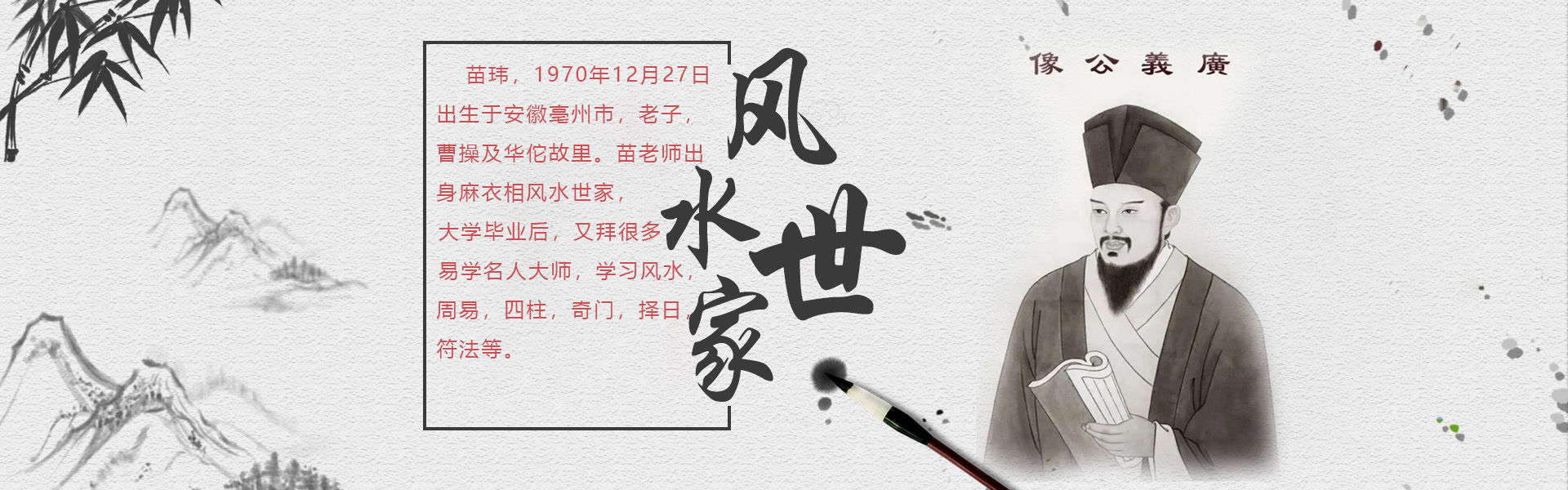 苗瑋,1970年12月27日,出生于安徽亳州市,老子,曹操及華佗故里。苗老師出身麻衣相風水世家,受家庭影響,對風水學有很大興趣,從小受爺爺父親熏陶學習風水,大專畢業(yè)后,又拜很多易學名人大師。學習風水,周易,四柱,奇門,擇日,符法等